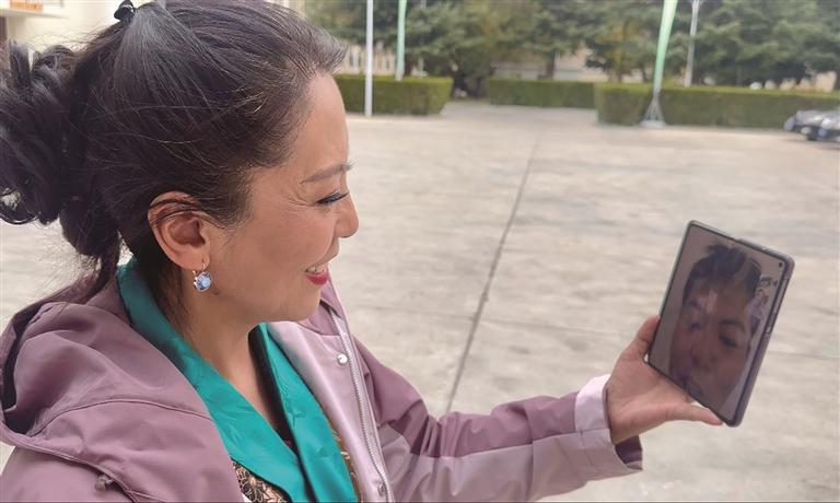 晉明吉措在工作之余與遠(yuǎn)在那曲的兒子視頻聊天。圖/記者 次仁旺姆